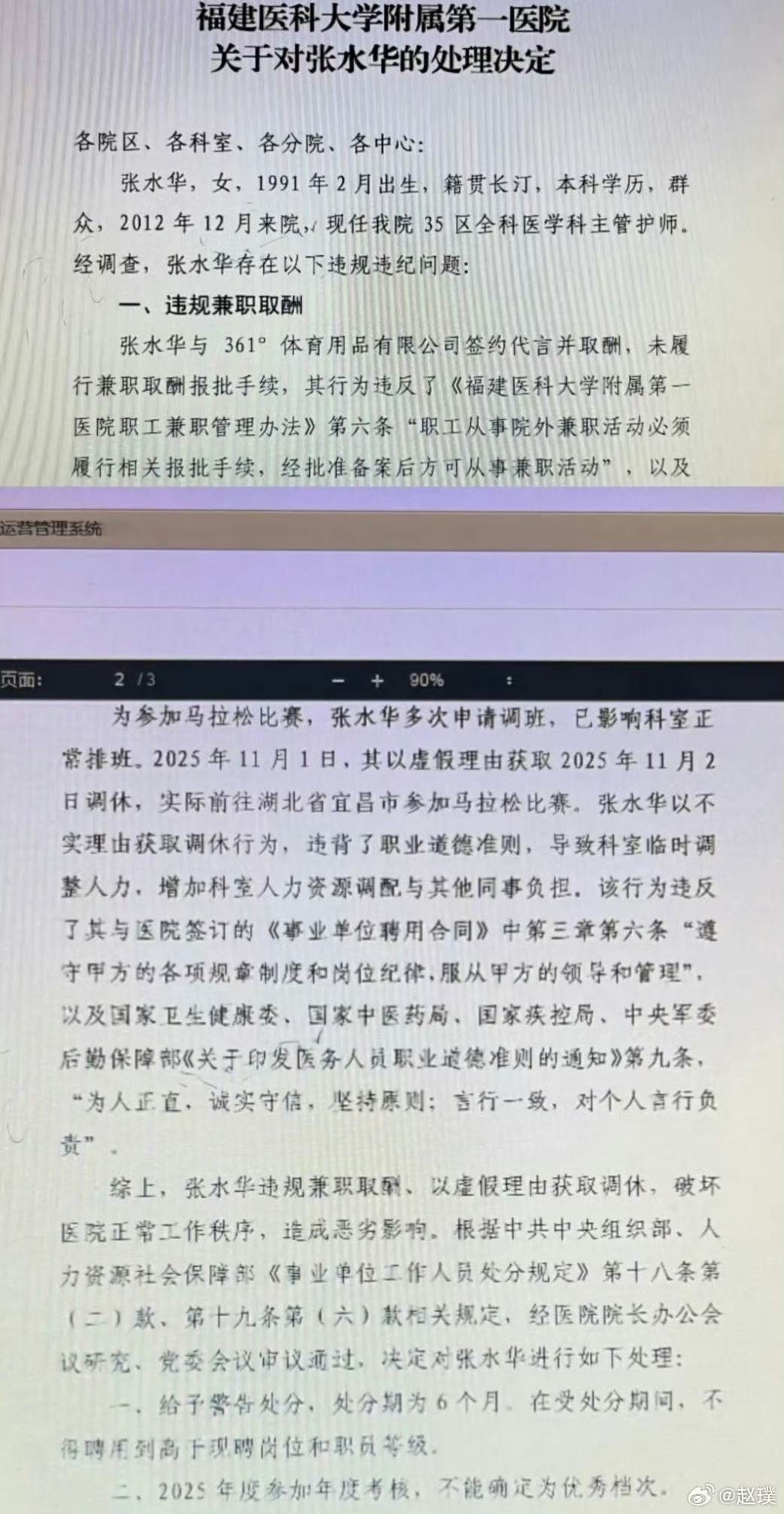 福建醫科大學附屬第一醫院確認,因多次未依規定調休、以不實理由請假參賽,以及未報備便與運動品牌361度簽署代言合約並取得報酬,「最快女護士」張水華遭院方記大過性質的警告處分6個月,期間不得晉升,並取消其2025年度評優資格。院方強調,其行為已造成科室排班混亂,影響工作秩序。