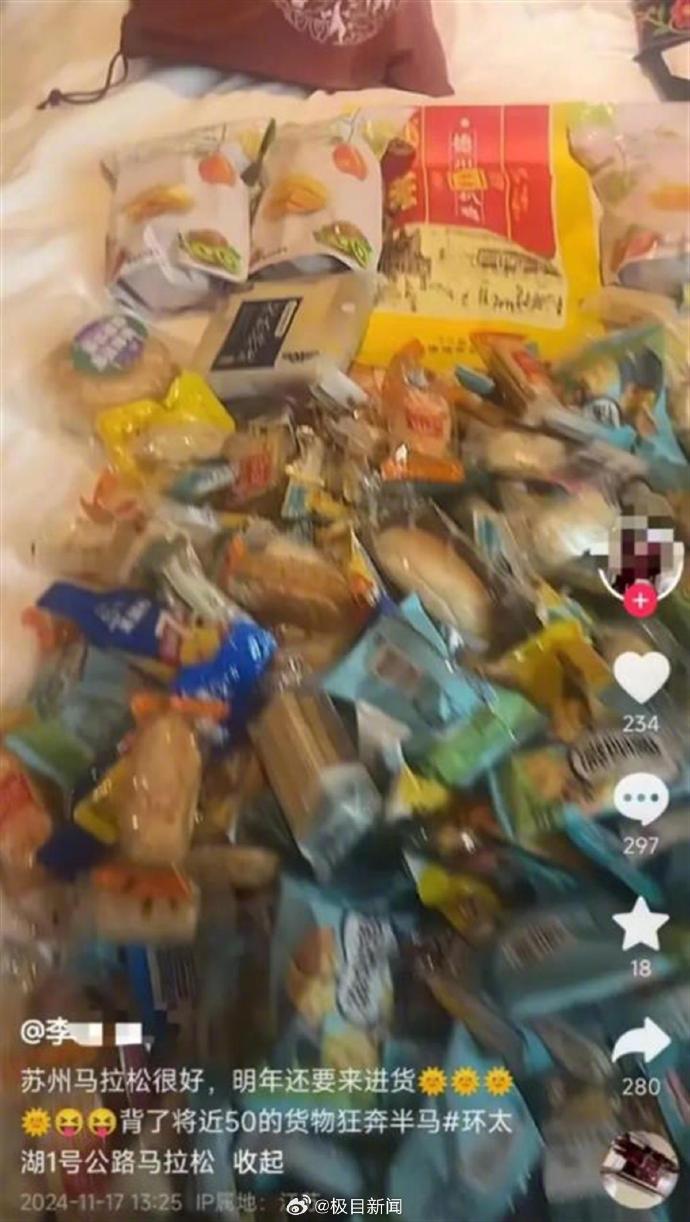 實際搜索網路發現,疑似「薅羊毛」的參賽者不少,一名暱稱「李粉X」的網友就透過短視頻帳號發布參賽經歷,並配文「蘇州馬拉松很好,明年還要來進貨」。只見她將大量餅乾、蛋糕、芒果乾等零食放在床上,幾乎鋪滿了整個床單,目測有上百樣之多,甚至說「好辛苦啊,背了有40多斤(約20公斤)吧!」