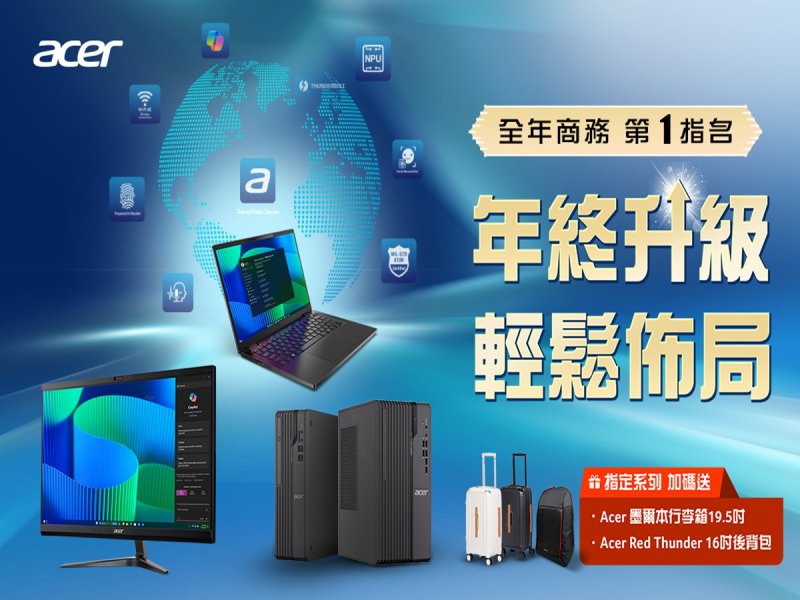 把握年底換機商機,Acer舉辦雙12商用機限時搶購超值送活動!幫助行動力升級,推薦購買Acer TravelMate P4/ P6系列商用筆電,享有輕巧便攜、高效能的行動辦公體驗、購買宏碁Veriton Z2524G AIO AI電腦,結合智慧功能與時尚外觀,讓辦公更輕鬆,是智慧辦公的新選擇、以及3D創作的好夥伴-宏碁獨家SpatialLabs 3D系列指定筆電及螢幕,通通享有限時登錄立即送【 19.5吋Acer 墨爾本行李箱】(市價$7,380) 具時尚外型,容量大,是出差旅行的好幫手。