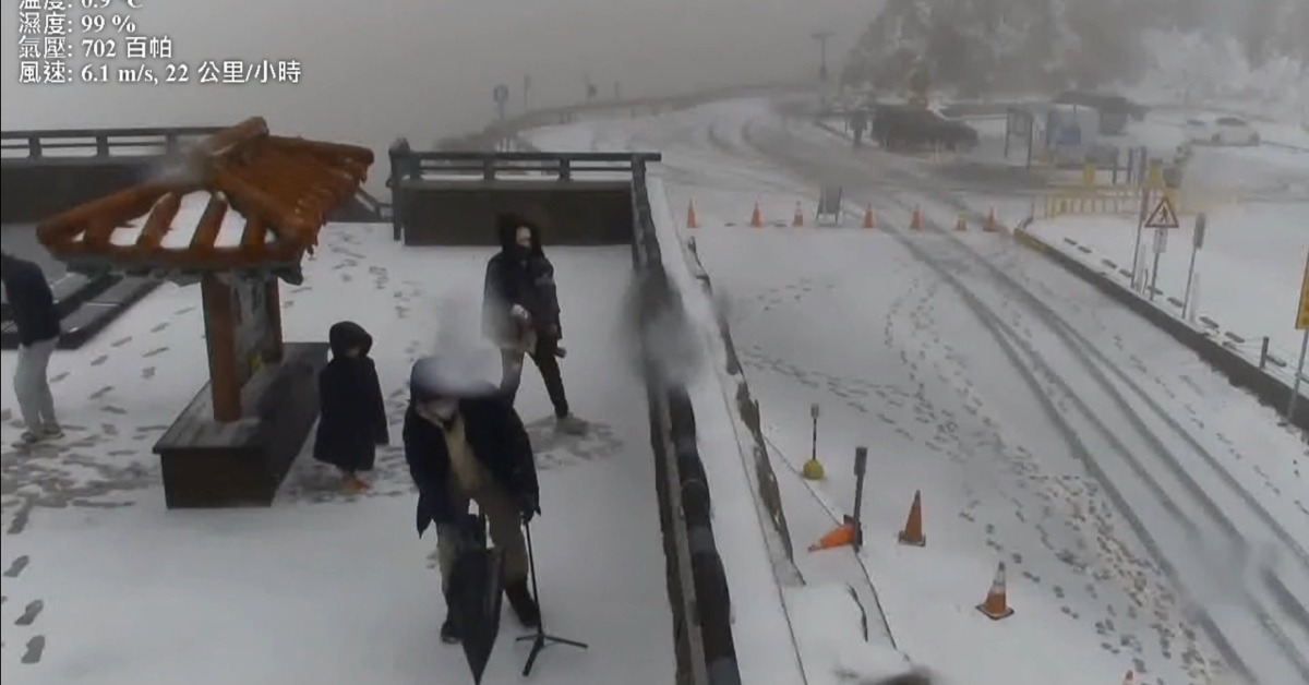 一大清早天還沒亮,合歡山松雪樓外已經是雪白一片,就像鋪上白色大地毯。民眾穿暖暖、戴上毛帽,走到戶外踩雪,在雪地中留下一個個可愛的腳印。往上走到海拔3275公尺的武嶺亭,及旁邊的停車場全是積雪。武嶺亭上通通都是人,雪白一片宛如冰雪世界。已經順利上山的民眾,也和這片雪景合影留念。松雪樓副理吳瑞結:「目前的溫度是0度,下雪的厚度約0.8公分。」