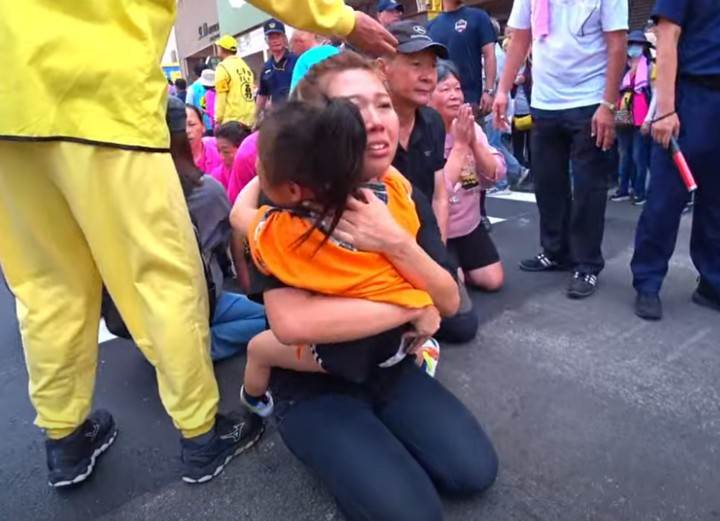 白沙屯媽祖今(8)日回鑾途中,吸引大批信徒沿途迎駕。其中,一名信徒在上午9時59分抱著年幼、尚不會說話的孩子,情緒激動落淚,場面令人動容。