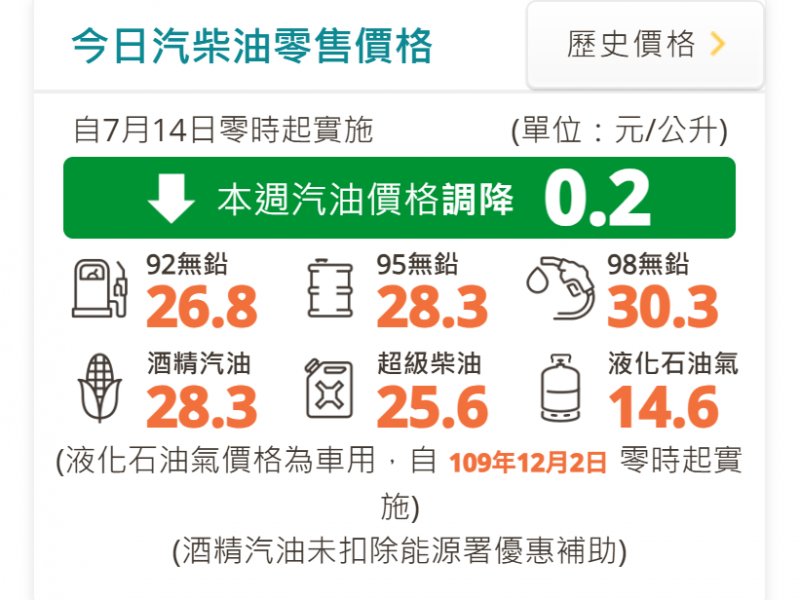 中油表示,自明(14)日凌晨零時起汽油調降0.2元、柴油價格不調整,參考零售價格分別為92無鉛汽油每公升26.8元、95無鉛汽油每公升28.3元、98無鉛汽油每公升30.3元、超級柴油每公升25.6元。