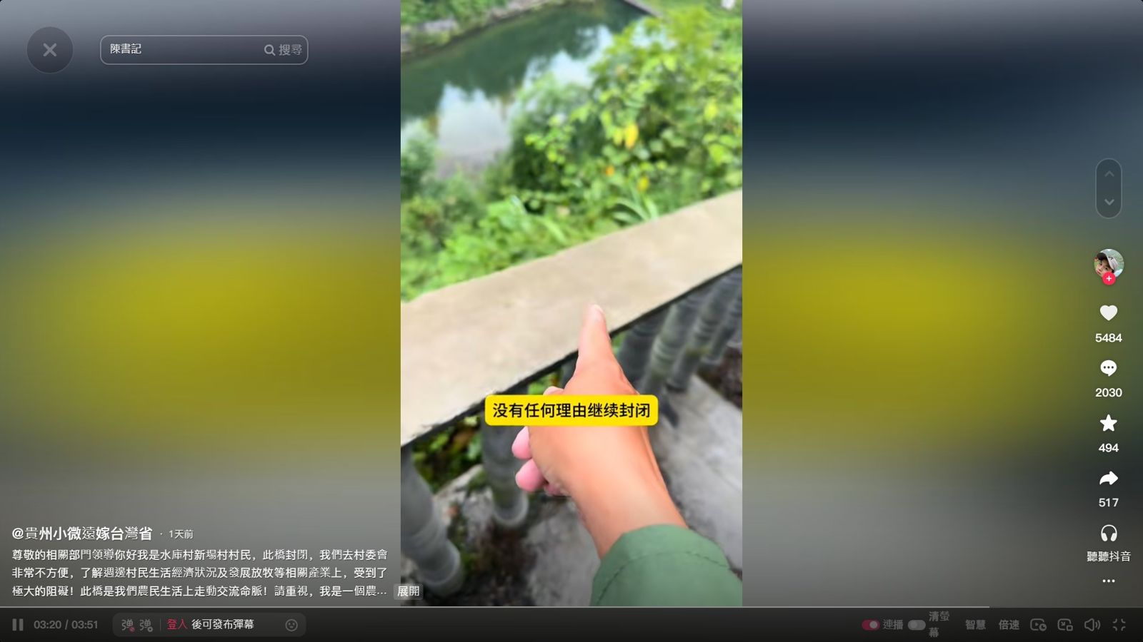 小微在近4分鐘影片不停為農民發聲,還說這橋有千萬個理由重新開放,懇請相關部門徹查相關審查與上報流程是否合乎規定。她也說,他們多次反映都沒用,「我們懇請領導能實地考察,親身體驗農民如今繞行上坡、下坡的艱辛及不便」;她還自薦「如果相關部門看到此影片,可以來找我了解情況!我帶你們走訪了解!」
