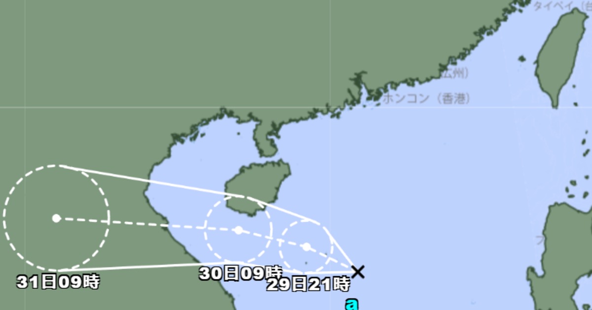 日本氣象廳今(29日)上午針對位在南海的熱帶性地氣壓發布烈風警報(Gale Warning),預估將在24小時內生成為今年第14號颱風「藍湖」(Nongfa)。