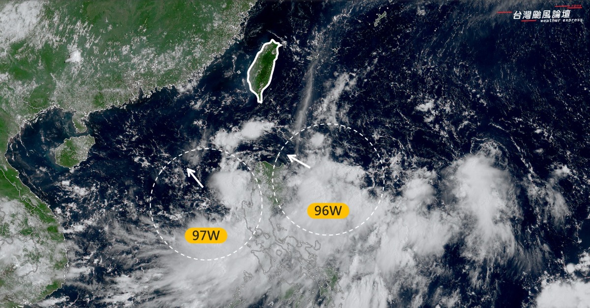 氣象粉專「台灣颱風論壇|天氣特急」發文,目前有2個熱帶擾動正在發展,分別是菲律賓東方96W與南海97W,96W將在週末期間通過巴士海峽,進入南海後與97W整合。當2個擾動整合完成後,有機會增強成為颱風,預估朝中國華南前進,不會直接侵襲台灣。