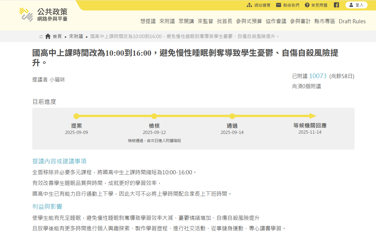 有民眾於「公共政策網路參與平台」提案,主張將國高中學生的上課時間延後至早上10點,並在下午4點下課。(圖/翻攝自公共政策網路參與平台)