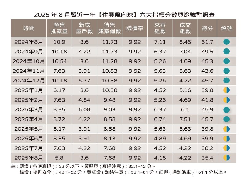 住展雜誌:8月住展風向球為今年的第6顆黃藍燈 分數是2021年8月以來新低。(住展提供)