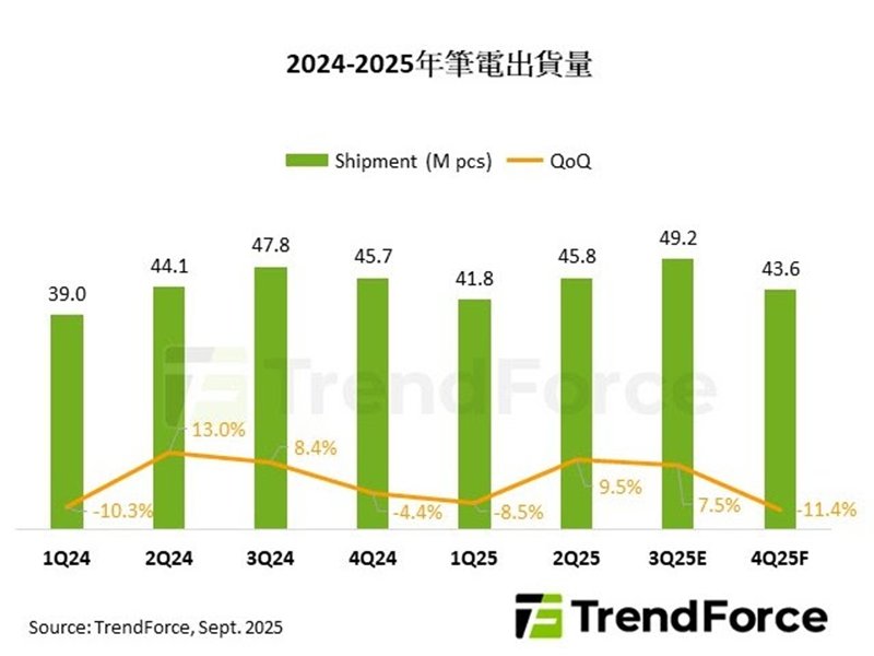 第三季雖然美國尚未公布半導體關稅細節,但筆電維持關稅豁免,同時品牌廠、作業系統供應商與CPU廠商持續透過補貼支持通路,預期出貨量將保持正成長,季增達7.5%。
