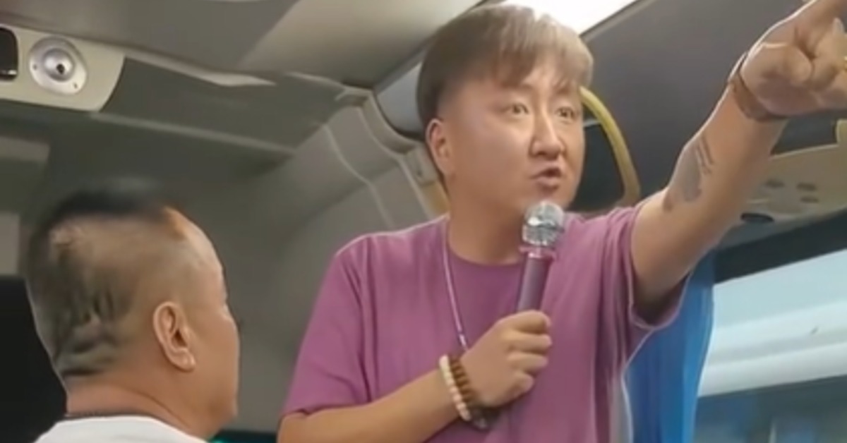 紫色上衣的男子,情緒激動拿著麥克風,對著遊覽車上的乘客大吼大叫,威脅民眾如果進入免稅店,沒有購物就準備等著瞧。原來一群中國團客到了泰國旅遊,疑似報名低價旅遊團,泰國導遊要求購物行程一定要購物,否則別想回到中國。泰國導遊:「把視頻給我刪了。」