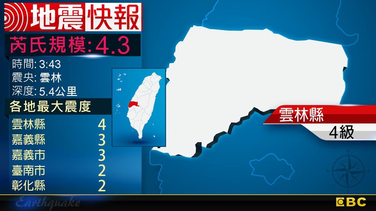 【地震快訊】 發震時間: 114年11月21日3時43分56秒 中央氣象署發布顯著有感地震最新消息,今(21)日3時43分,發生芮氏規模4.3有感地震,震央位置